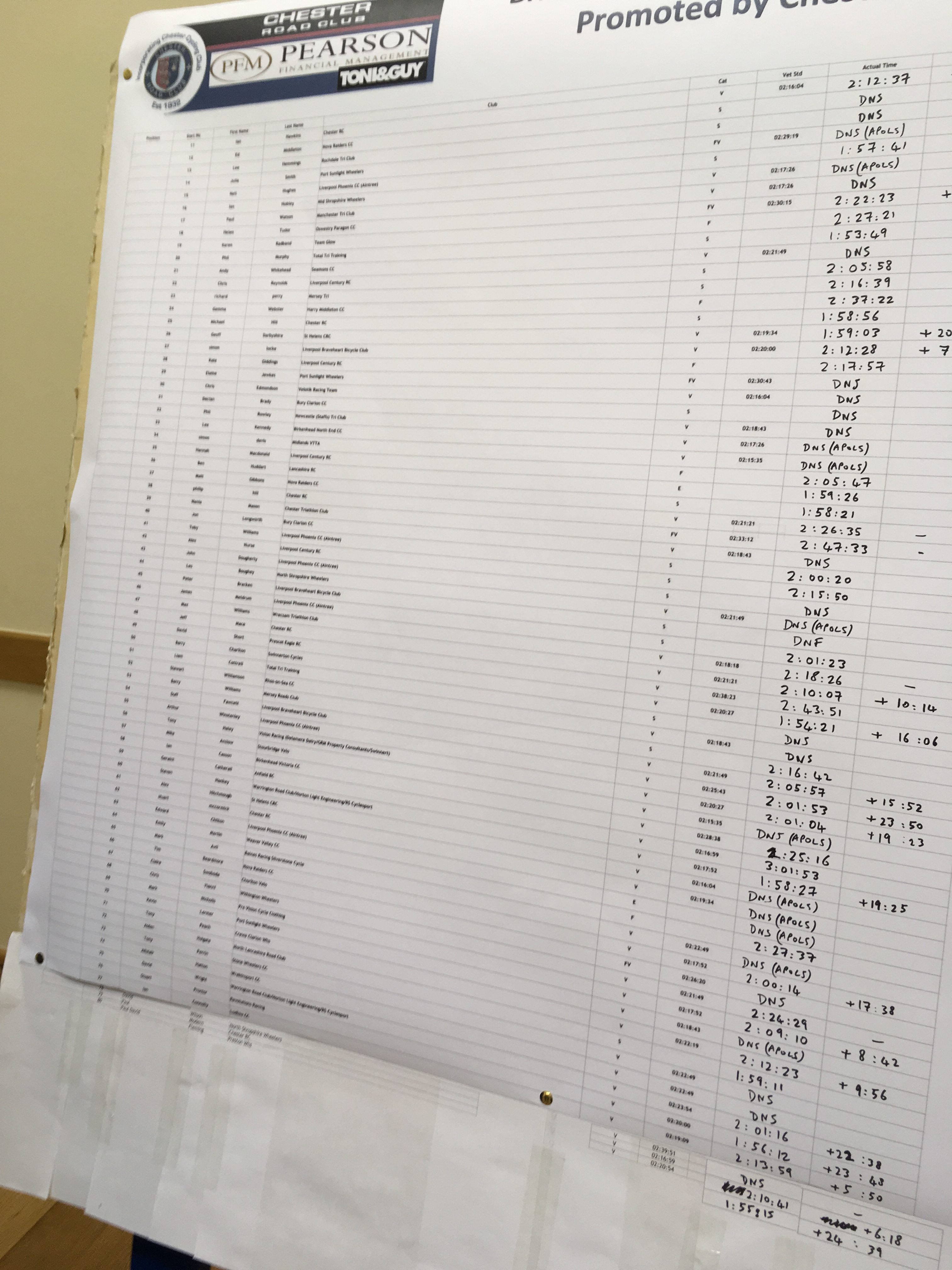 I was 4th amongst the ladies with Hannah Macdonald of Liverpool Century RC doing a 2:05:47, and the overall winner was Phil Murphy of Total Tri Training with a 1:53:49. Very good times considering the weather.
