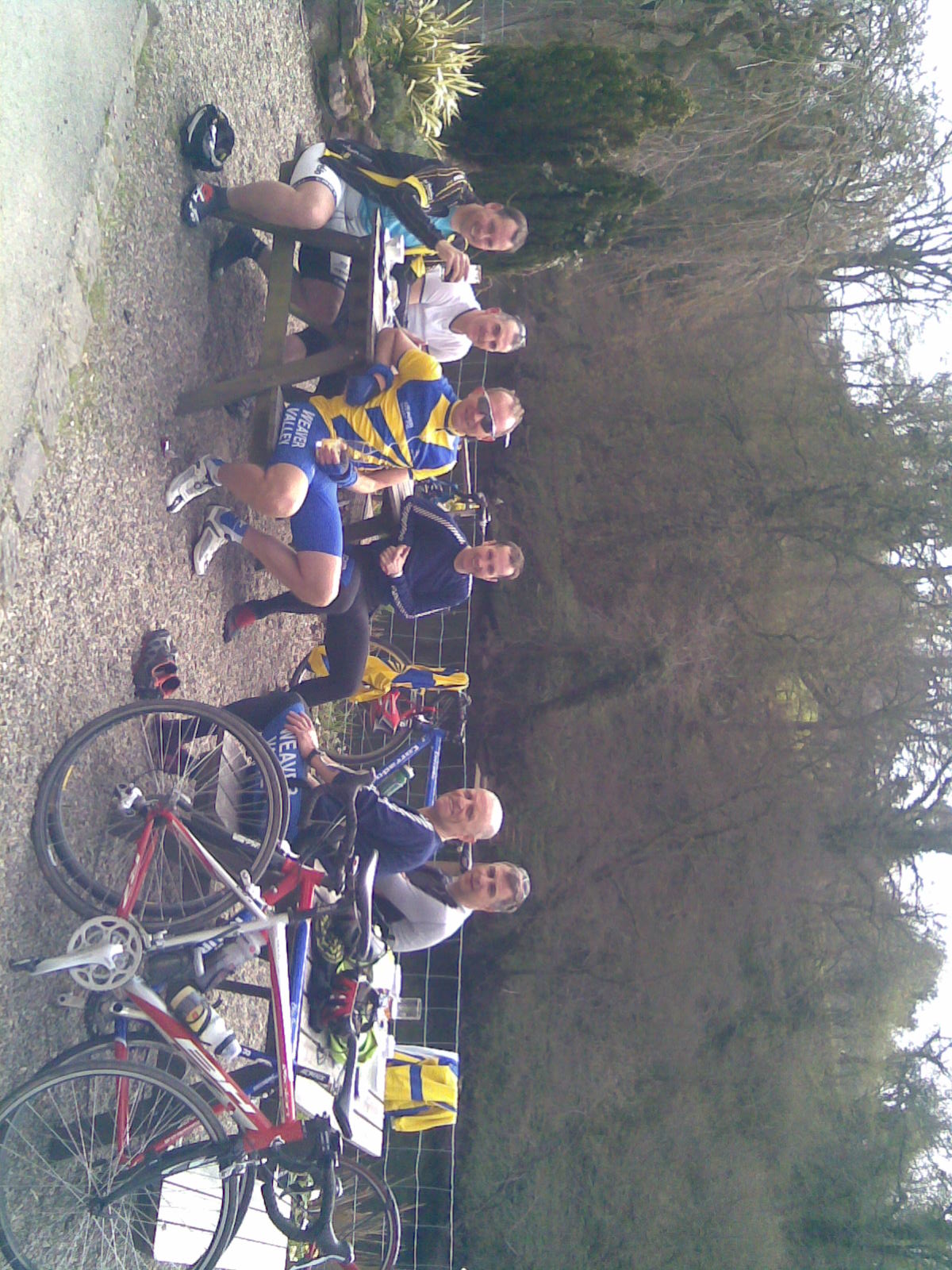 A good turn out at Hartford – the shorter group set off for a circuitous ride to the ice cream farm whilst I joined the longer group, setting off to Bangor on Dee and led by Richard Munro. There were nine of us, some of whom were dressed for a cold winter’s day. As we rode through Whitegate the mist cleared and the sun shone, and by the time we got to the top of Harthill on the Peckforton ridge we had some very hot riders! This was spring cycling at its best, past a succession of chocolate-box villages and old sandstone churches, with hedges greening up, trees in blossom, lots of daffodils and even primroses along the verges. Graham, Dave Astles and John Green turned off for Holt and the rest of us continued on to Bangor, at which point Chris came up with the idea of extending the ride to Erbistock – a pretty hamlet next to the River Dee – pretty enough to make the price of the posh (but minimalist) “open sandwiches” tolerable!