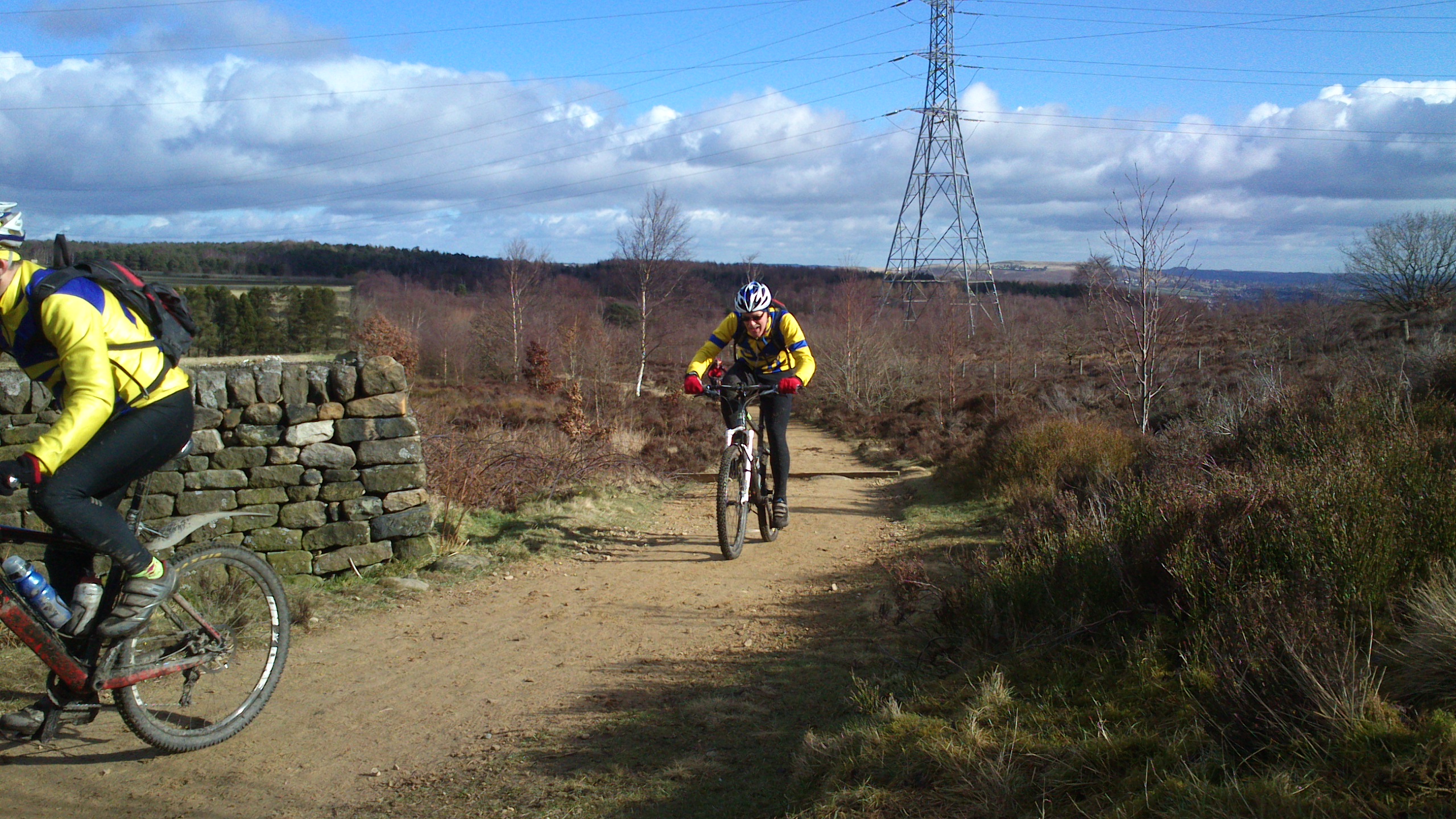 In the end though, the weather didn’t turn out like that for the main ride. It was a chilly start, but on the ride we had not a drop of rain the whole route. And what a route! The map did make it look like there’d be a fair bit of road portage between the good bits* but in the end there was very little. We started from the lovely Oxenhope terminus of the Keighley and Worth Valley Railway, where thankfully after the other week’s Delamere trip the pre-ride brew was back on the menu in the railway carriage buffet. It took a couple of missed turn and detours to get tuned into the map reading and Garmin following, (Kev was quite surprised that his trusty navigator announced we’d arrived at our destination after about 1/2 a mile) but we were soon on our way over the Black Moor towards a cracking decent following the boundary of a landfill site and on to the village of Cullingworth.