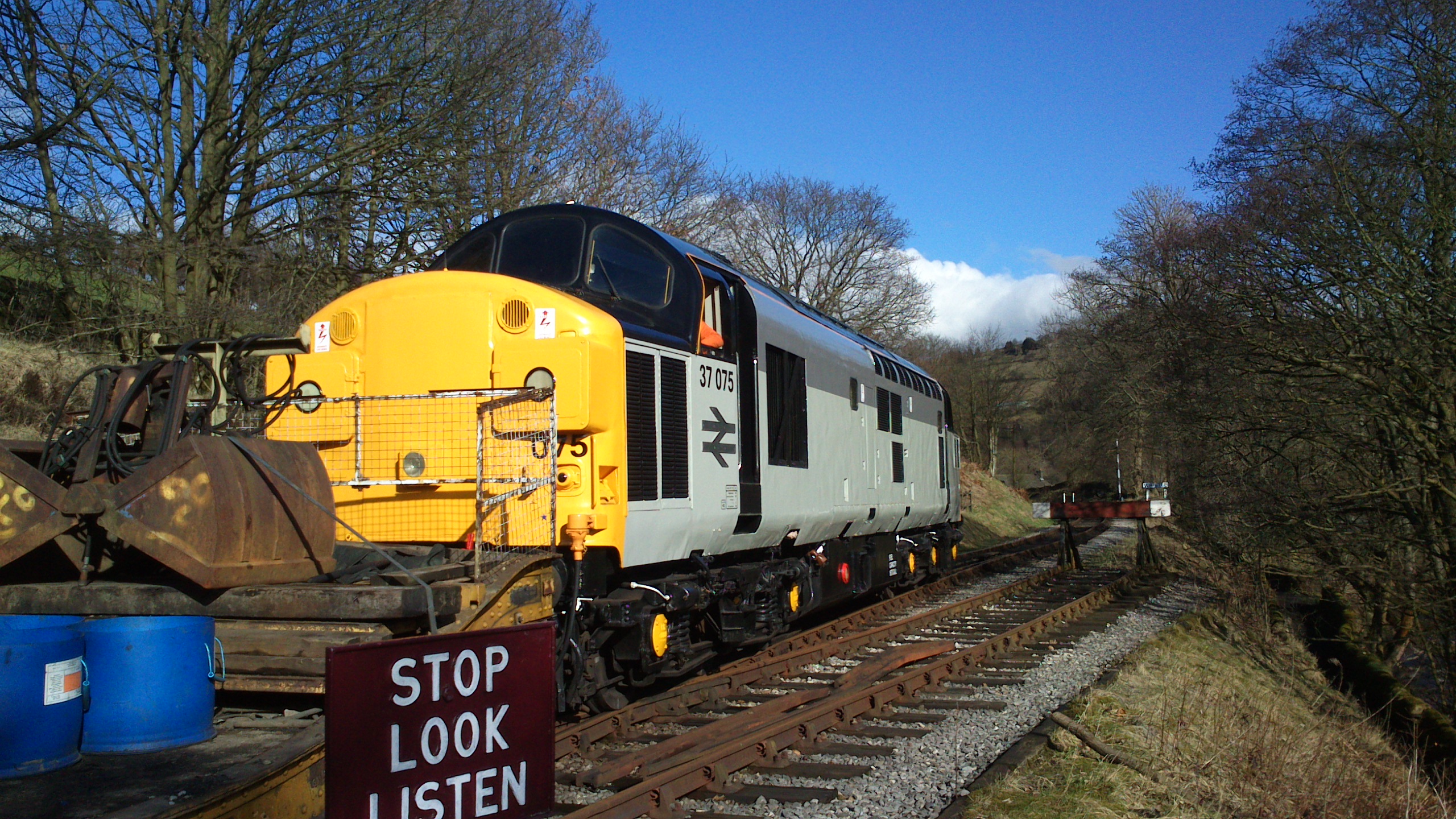 From here we followed more techy tracks, proper little slippy, nadgery little affairs in places where Nick, standing at the bottom of a muddy chute taking pictures nearly got wasted by by a slightly out of control Steve. Finally it was a few miles back towards a path following the river and railway valley back to Oxenhope. This is where we were treated to the magnificent class 37 Diesel Electric engine pushing a maintenance trailer down the line, pausing long enough at the points for a decent picture.