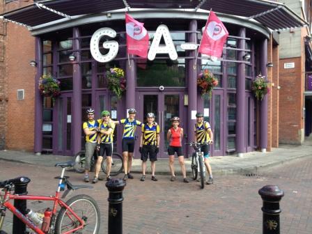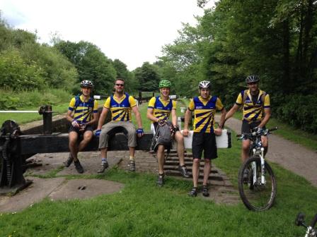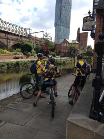 And so many people. Not just my five comrades who were unremittingly funny and kind; but all the other people we met. The beautiful young girls in pyjamas opening up locks at 8 a.m. (now Titch if you’d known about that you’d have come, wouldn’t you?!); the Irish guy in Sale when we stopped for coffee, who told us we were wearing County Cork colours (is that true?); the many dog walkers and pedestrians who greeted us warmly despite the irritation of having to stop and let us past. Drunken youths in Manchester (at 11 a.m.) who cheered Matthew on (“There’s only one Bradley Wiggins”). We’d stopped to work out which of several canals we should be following, but this encouraged them mightily, and thinking their affection might turn, Andy decreed “any canal will do, let’s just get out of here”. At which point his attempted track stand failed and he attracted even more cat calling. Narrow-boat owners with long flowing grey hair, beards and sandals…and yes, pipes. The fat bloke with the pit bull who, when we went past, shouted out “you’re not allowed to ride bikes on the tow path, there’s a bye law against it”. The crowds in the pubs we passed, enjoying the sunshine; and the girls on the cruise boats, also inebriated (were we the only sober ones on the canal?) inviting us to join them for a drink (I don’t think it was me they were after but hey ho).