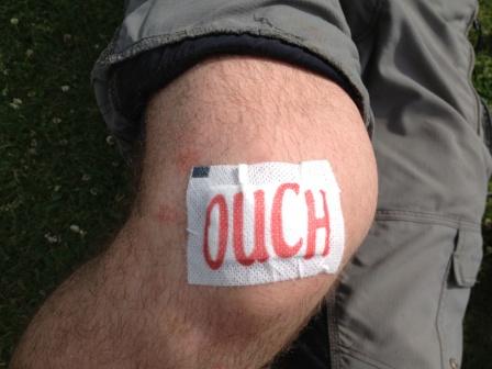 The ride in numbers: 6 riders, 100 miles, only 2 punctures (Dave please note!), one minor injury, one near fall into the river, 12 hours in total, 8 hours 15 minutes of riding, average speed 12.3mph (varying from stretches at 18 mph to others at 6 mph) and surprisingly, 1300 feet of ascent. Here is our minor injury, caused when Andy fell into a fence: