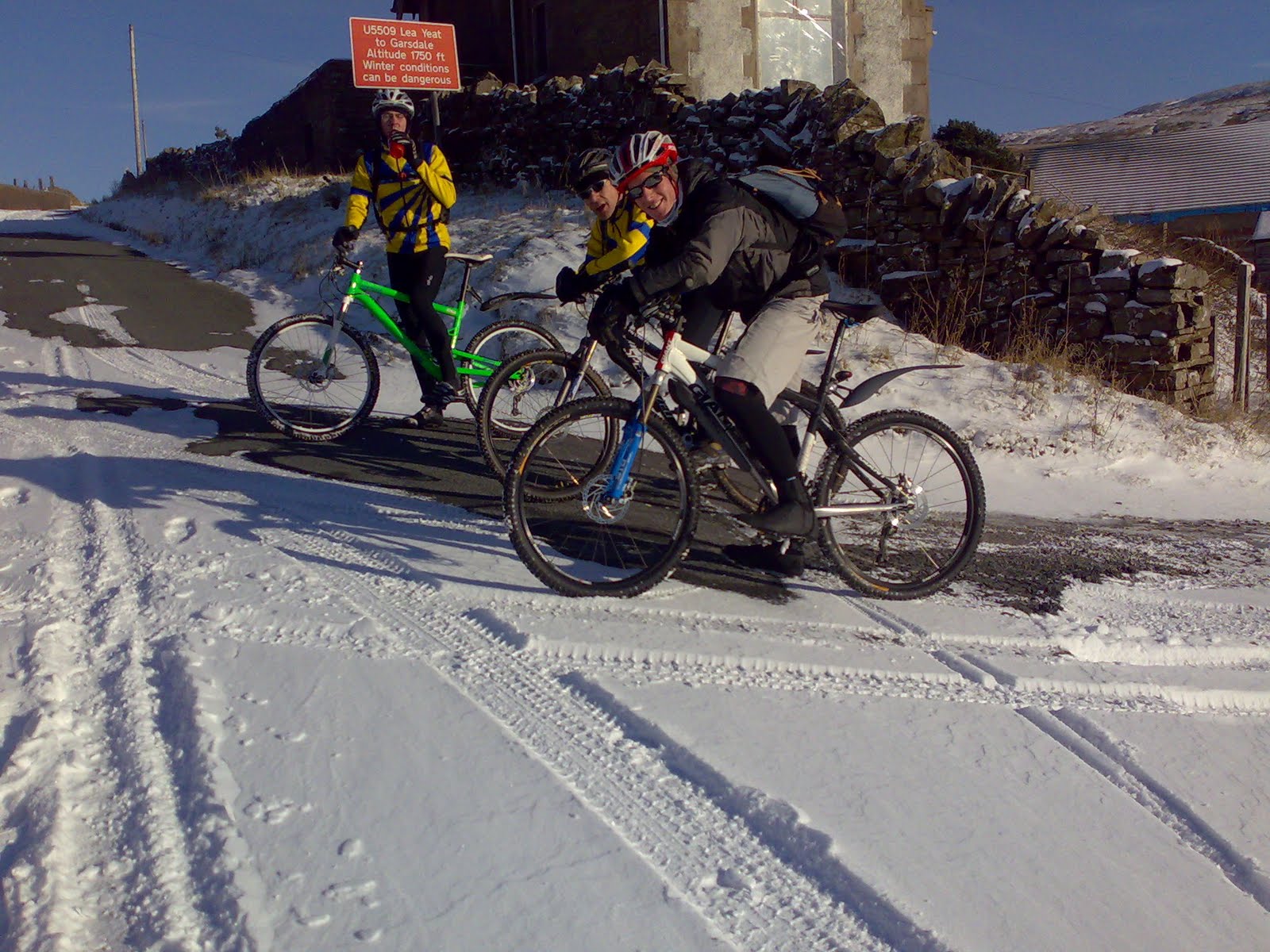 Despite, or perhaps because of the snow, it was a brilliant weekend based at Dent in the Yorshire Dales. The bunkhouse at Whernside Manor did us proud although some of us didn’t get their cars along the snowcovered lane to it. Eight of us stayed over Saturday night with Matthew and Derek (the gate boys, pictured below at Dent station with Kev) joining us for Saturday’s ride