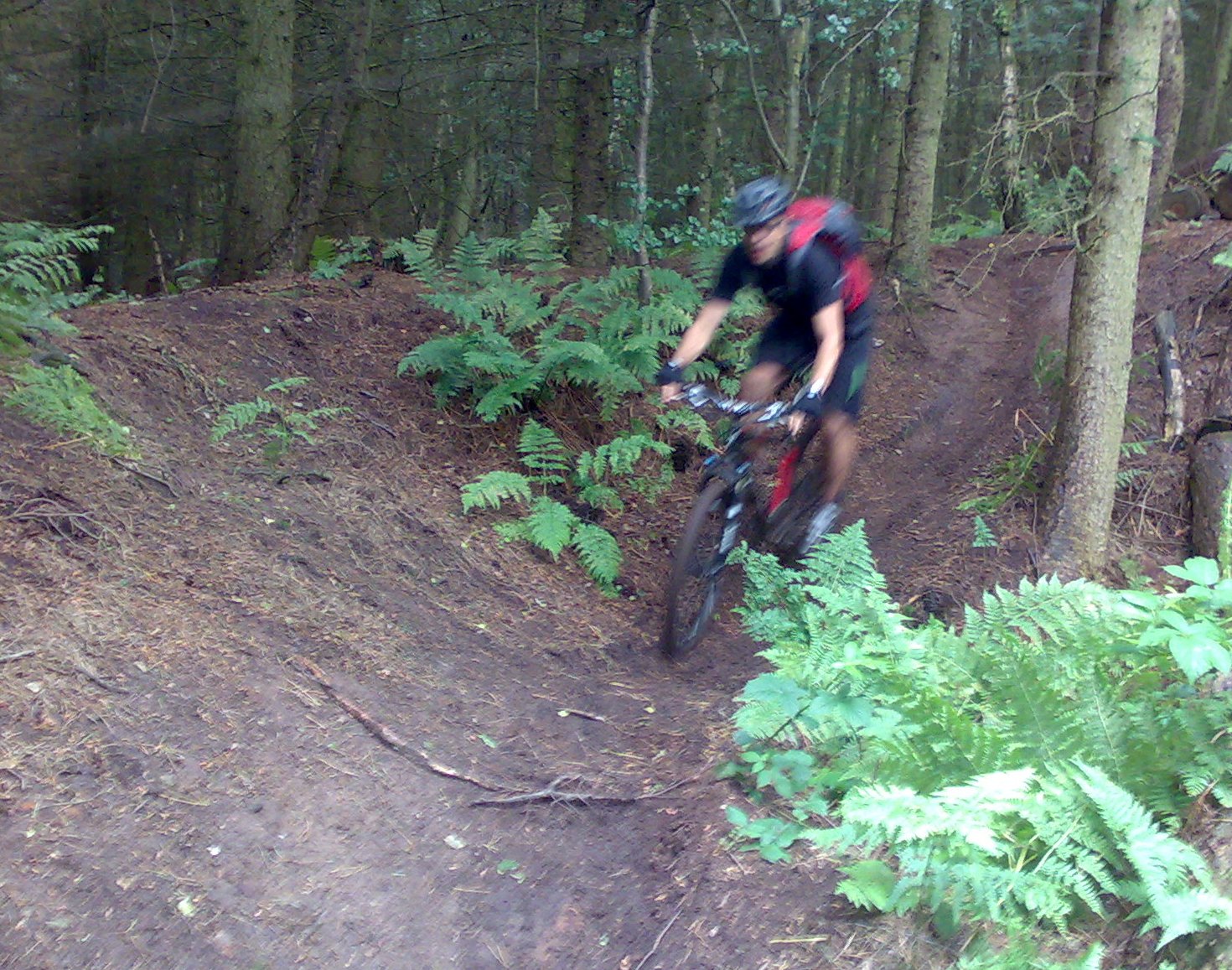 Here is Kev U showing such speed that he’s just a blur (must get a decent digital camera) on one of the many sections of singletrack we covered. John showed us a couple more “new” sections which I have committed to memory. A very enjoyable ride despite the heavy rain halfway round and the mud which was fairly deep in places.