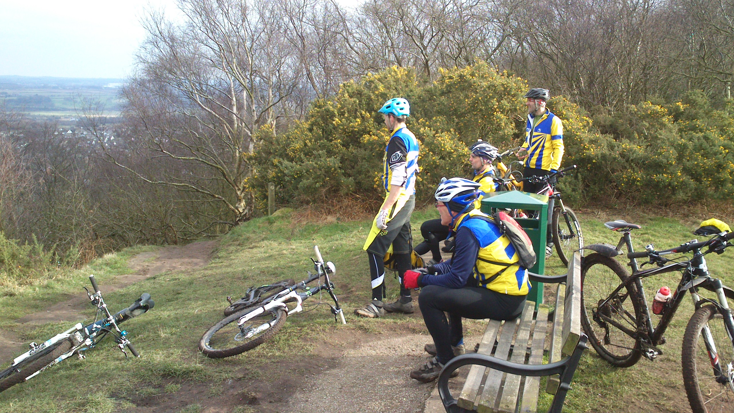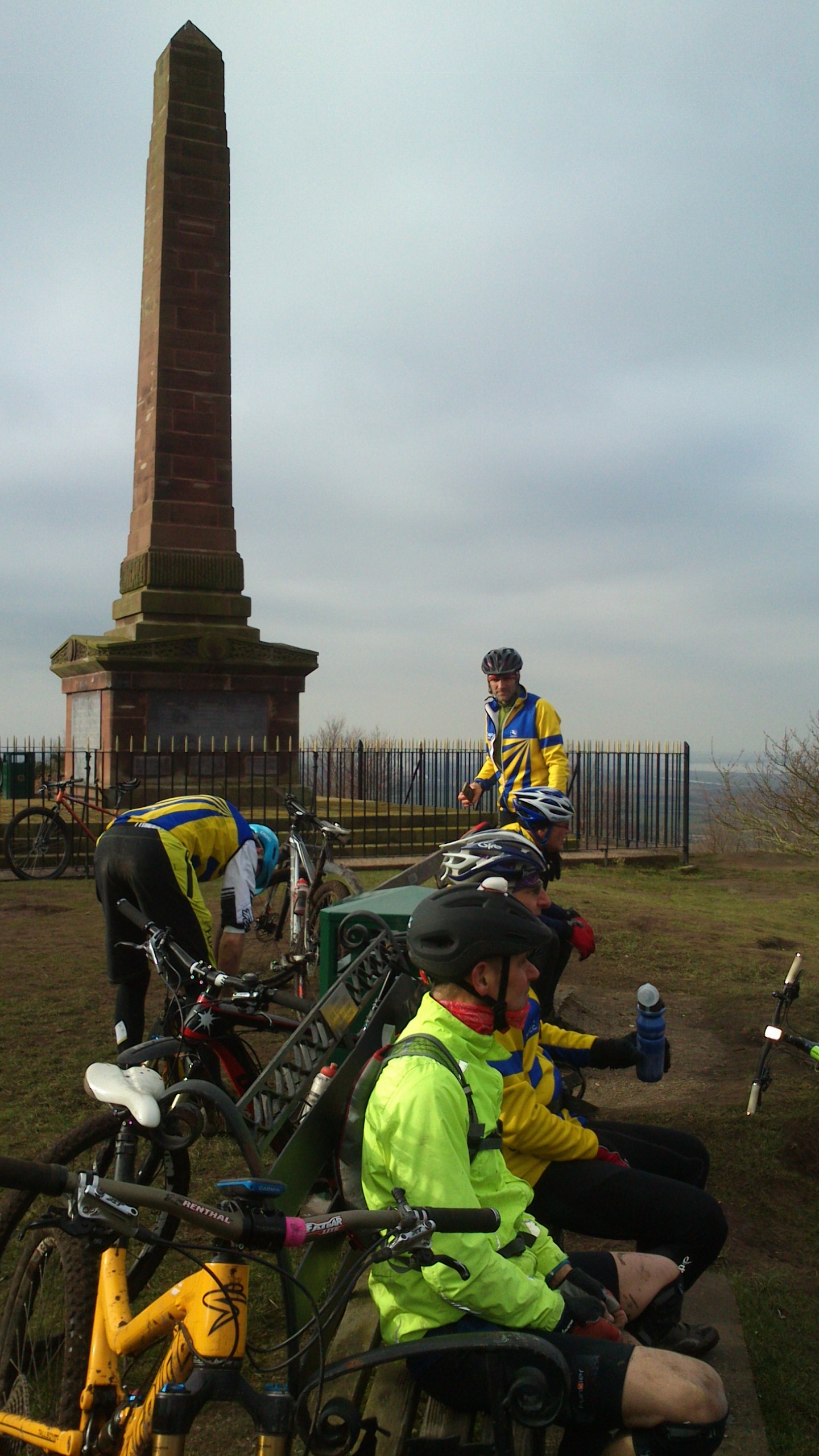 There were other signs of change today too. Wagon wheeler 29″ mountain bikes outnumbered the traditionalist 26er and we didn’t pause at the cafe for a brew before heading out to the forest and novel permutations of old favorite and new exciting paths. Our meandering way eventually led us out of the trees at Waterloo Gate, near Kingswood Park, first to the roads then some lesser travelled Sandstone lanes, eventually arriving at the hill fort on Woodhouse Hill. From here we were sharing the tracks and paths of the Sandstone Trail with friendly walkers and their dogs until we arrived at the Frodsham War Memorial. Unfortunately the clear skies had not persisted from the early morning, so we were denied the usual views of the Peak District and beyond, our vista limited to industrial Runcorn, Warrington and not much further.