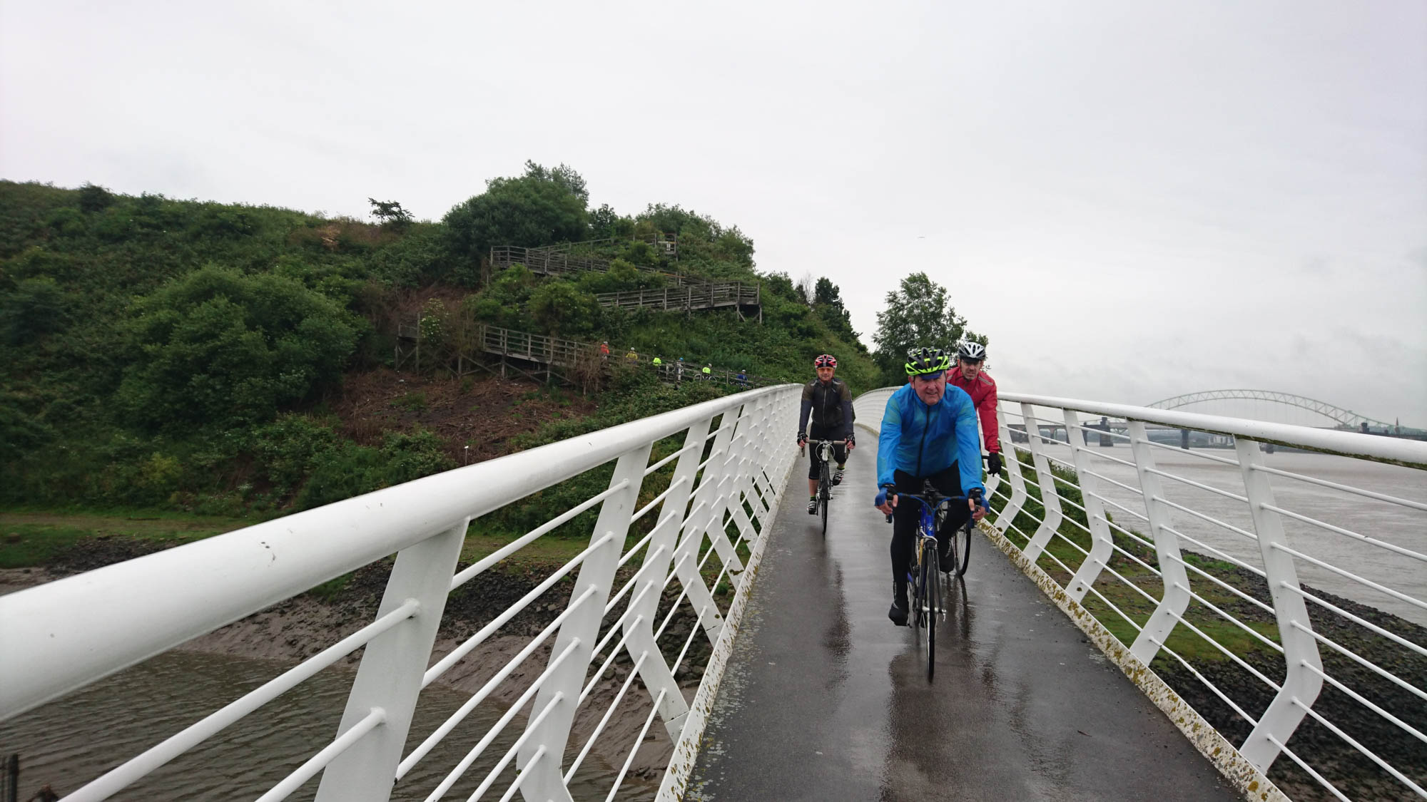 We thus set off promptly from Sutton Weaver, knowing that we had yet to purchase our passage en route. It kept raining. We headed towards the bridge. It was still raining, We were pretty wet already. Not wet enough it seemed as I led the group towards the bridge on the path. I noted that an articulated truck headed towards us had already hot a lrage puddle in the road, spraying it in a lovely arc wave across the pavement. It passed, followed by a pickup that did the same, but to a less impressive wave. ‘Ah that’s alright, at least we missed that’ I thought. That thought, fleeting though it was, had barely exited my tiny brain before a fresh articulated truck headed the same way. I was next to the flood, the artic drove through said flood and released what I’m sure was just a splash, but felt like a tsunami. Now I was wet. Jim was amused.