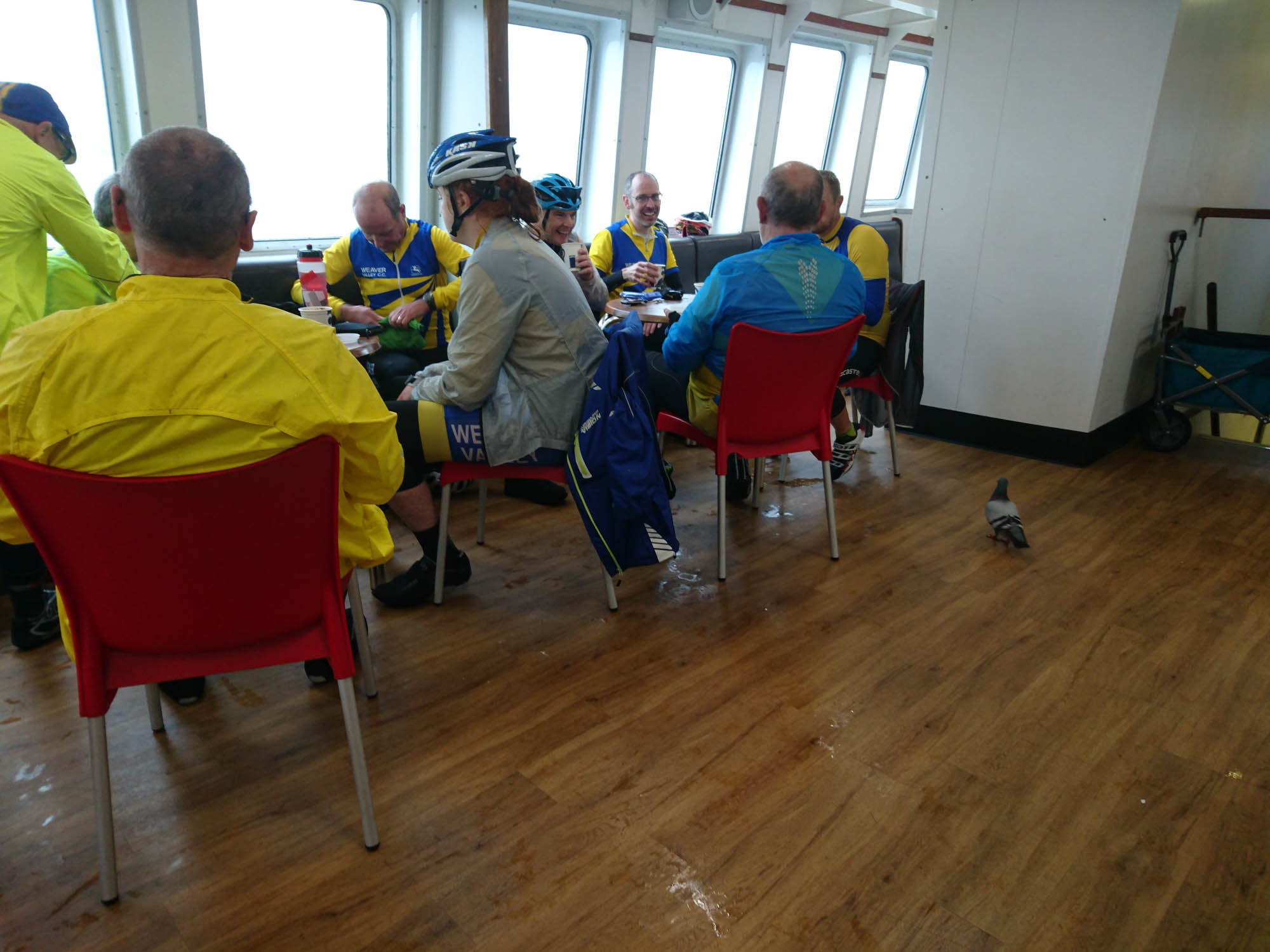 Freeloading pigeon joins Matt and Jim in a relaxed moment on the crossing, listening intently to one of Jim’s anecdotes. I think it may have been the one about the 24 hour and the a**e cream. Hence why he’s changed his mind about eating the crumbs.