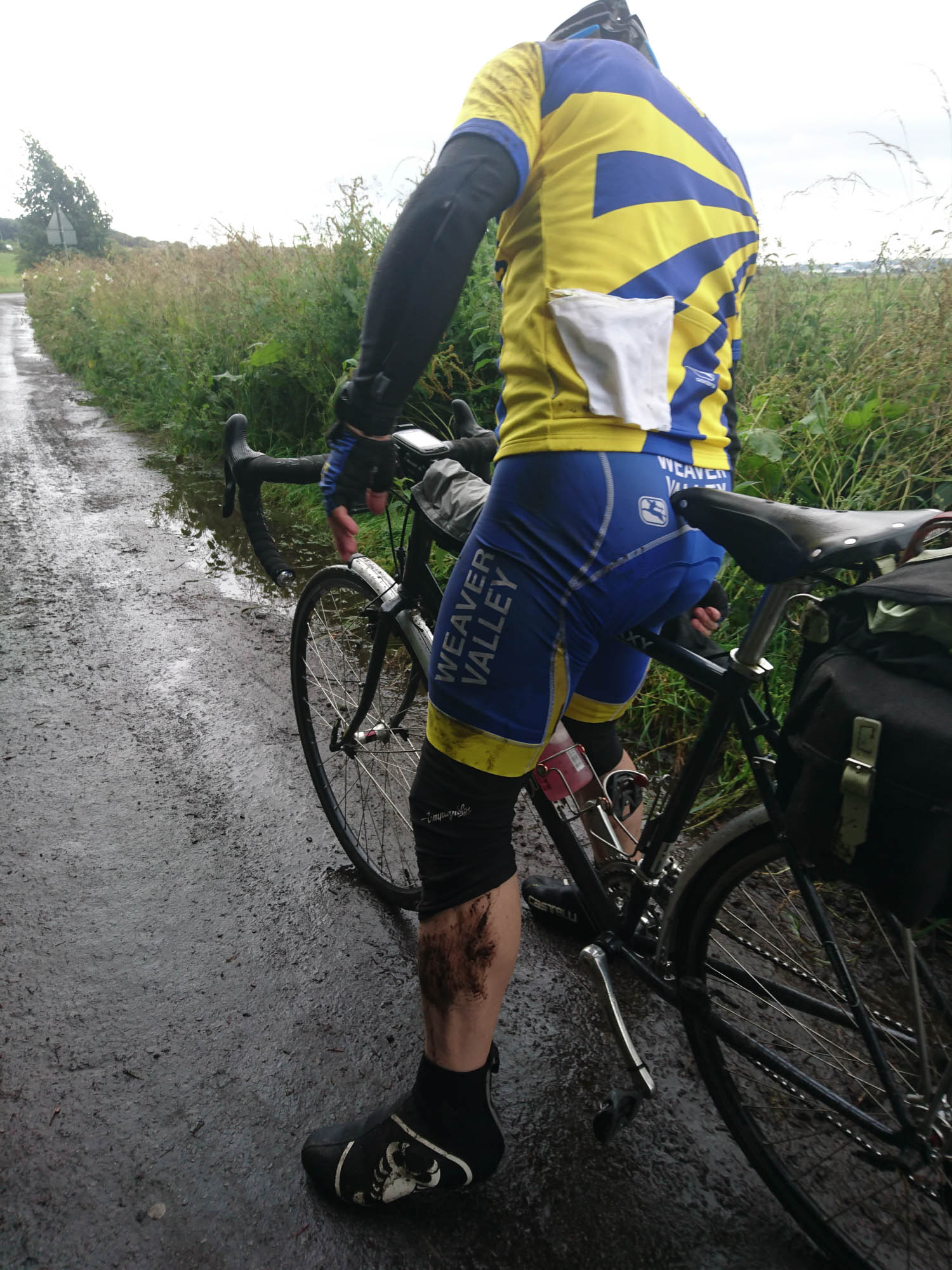 Soon, we were out, and ready for the off, we dropped down to the road and headed out. Only a few speed humps to negotiate etc. No problem. There was something missing though. I had wanted to play in the sand earlier, but didn’t get the opportunity, so, as I skirted round a speed hump, closely following Matt, my wheels took to the edge of the road, where it was ‘puddled’ only to find that this was where there was no ‘road’. My wheels tramlined into the dropped groove, and I elegantly rolled, gently, from my bicycle onto the floor. With no damage to man or machine, I got up, satisfied that I had at least made an effort. Jim was amused, He insisted on a photograph.