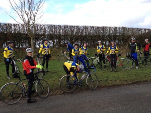 A good crowd rolled up to the Legion this morning, the 2 inches of snow on Friday evening had been washed away by heavy rain and improved tempatures on Saturday. Although the wind bitter, the temperature wasn’t too bad (and compared to previous weeks were a barmy 6 degrees C). A small group headed for training miles with Kempy while a good 20 headed to the freewheel champs at Siddington. You know it’s an occasion when you get Westy and Tommo rolling up for a second club run in as many weeks! It was also good to have Kev and El on board recovering their legs from a tricky Saturday off road ride.