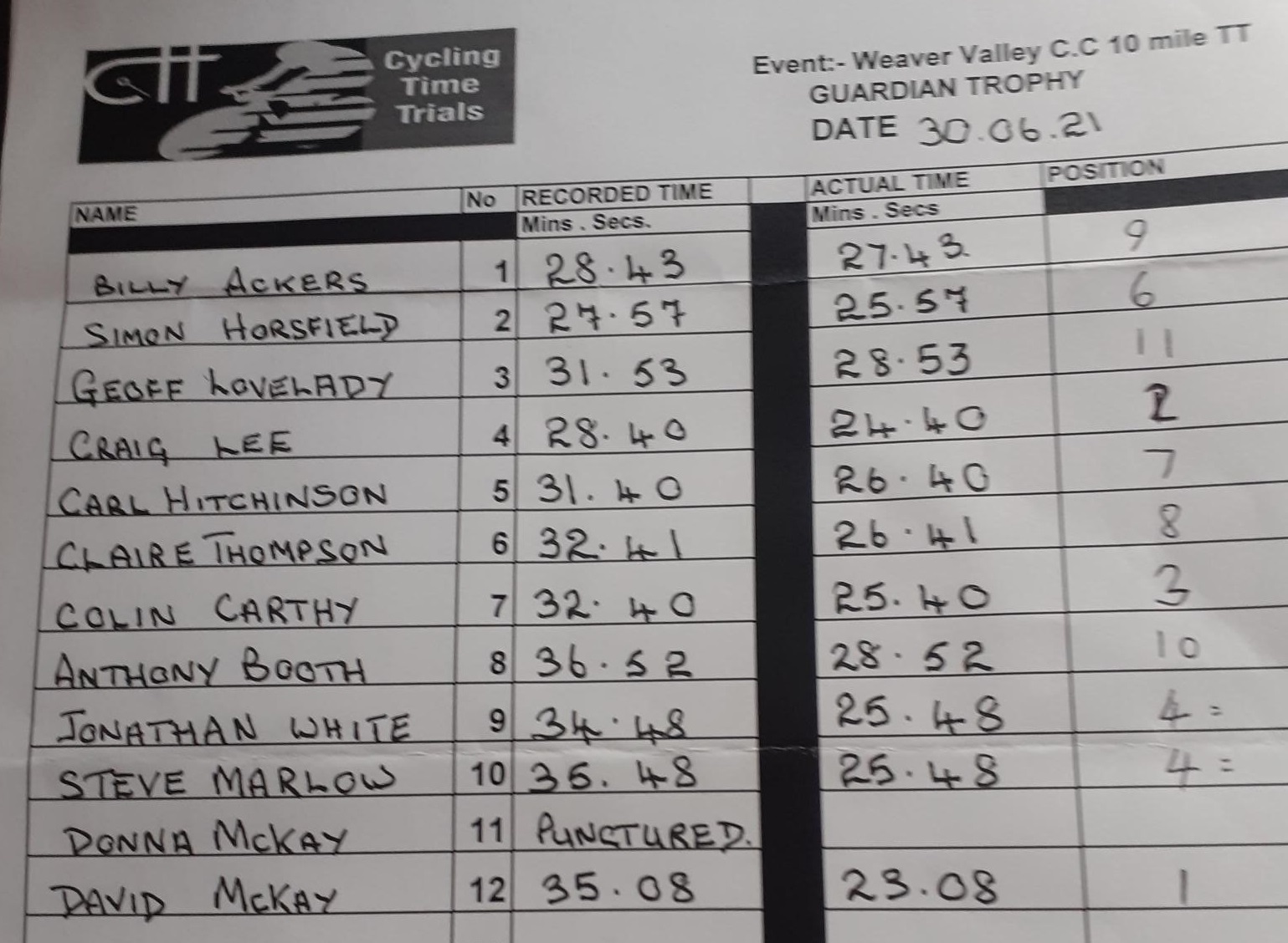 Pos | Rider | Actual Time | Current PB | New PB | +/- Sec s | Guardian Cup Points | Scratch Cup Points |