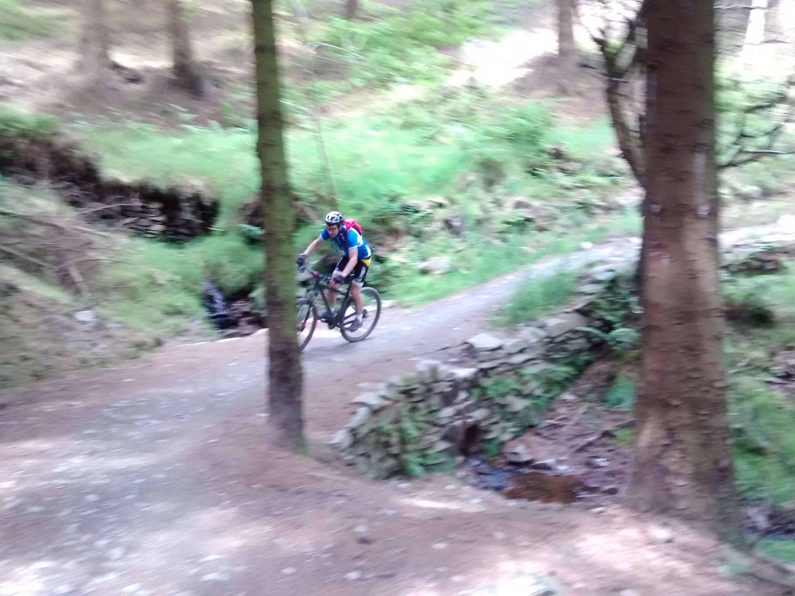 There were three others champing at the bit to make a start by the time myself and Giles turned up and after a little delay to deal with an errant car alarm, Andy and Karen Boyle, Steve Cox and the two of us started off on that long grind up to the top of the forest. The Boyles peeled off to ride the Red trail leaving Giles, Steve and myself to blast the black. Steve’s day unfortunately didn’t last much longer due to stripping the thread on his rear QR skewer nut after repairing a puncture, he sensibly opted to roll back down the fire roads rather than risk the wheel falling out.