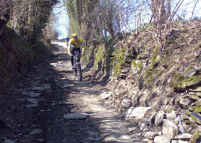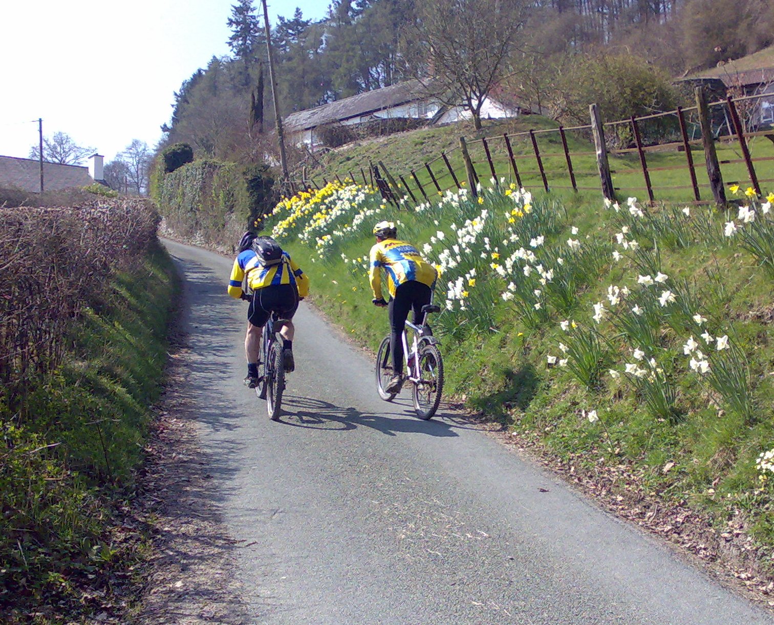 Six of us enjoyed the finest day so far this year following the routes from Llangollen recommended by Kev C’s friend Pete, who was unfortunately not well enough to join us. Kev C, Chris Gregory, Rob Jones, Steve Cox from the Crewe, Eleanor and I made up the party. This is Rob enjoying one of the green lane descents. Of course the only way to gain the height for this was up steep climbs, but even these were pleasant on such a fantastic day with the daffodils out.
