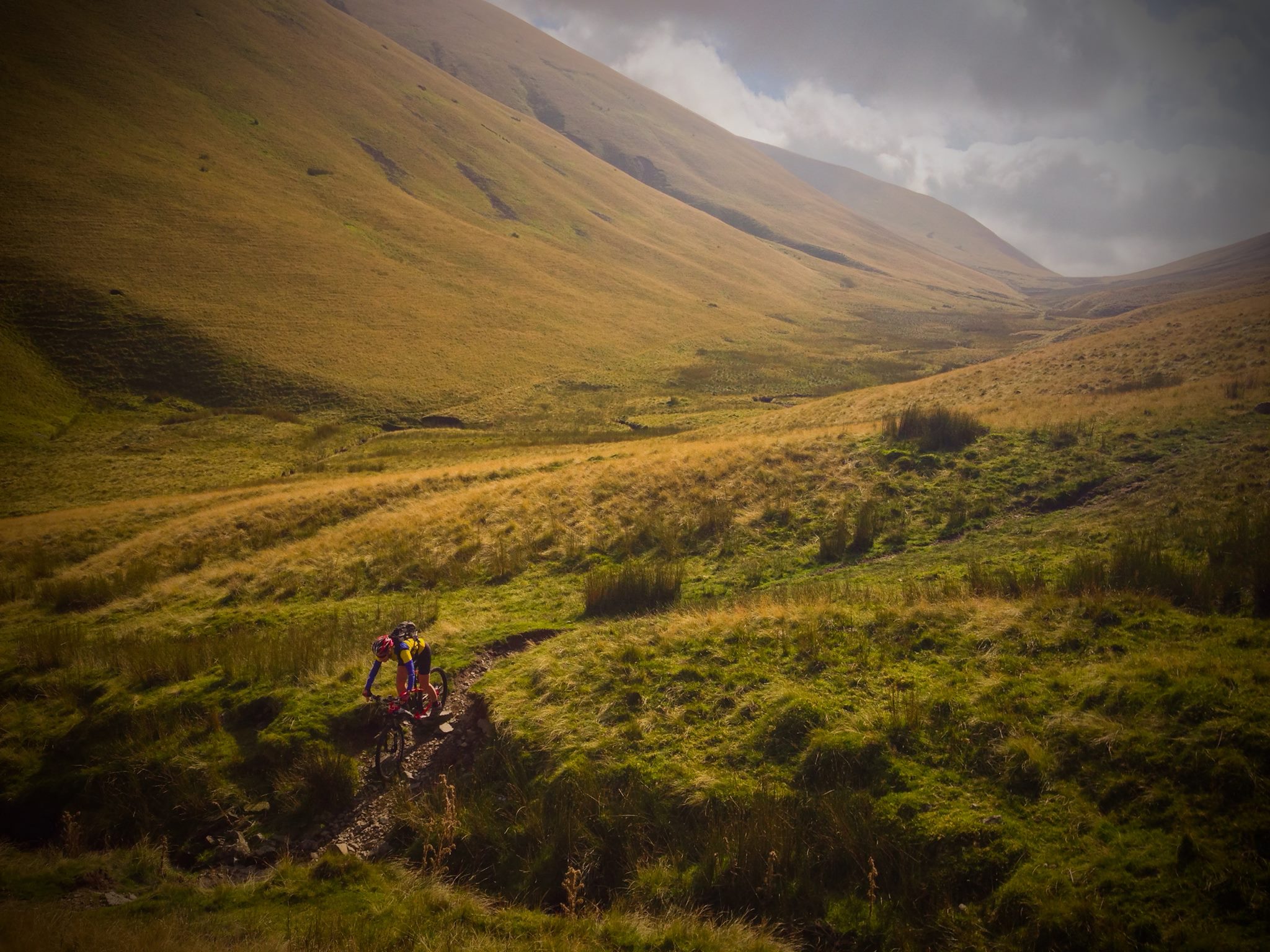 After a brief pause at the top to we started on one of the most exceptionally beautiful trails I’ve ever ridden down. Following the line of the Bowerdale Beck, we descended for about 5 miles down a lush green valley, our only company being sheep and a small herd of black wild ponies. The trail itself, probably made by our ovine companions and their shepherds was narrow and rocky with a lot of small gullies just right to grab a wheel and cause a spill and tributaries to the beck to making for a fun ride all the way to the line of the A66 via a mercurial pro-montary, (ask Eleanor – each one of us came home with a significantly enriched vocabulary). Thankfully we suffered no major spills or crashes, but at least one wet foot each from some deep and permanent looking puddles.