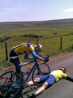 Pic 3 – Dave Fearon collapses having climbed the above-mentioned hill on his fixed 74″ gear bike. Lou, having himself climbed the hill at breakneck speed, just manages to come to a stop within millimetres of causing a nasty accident…