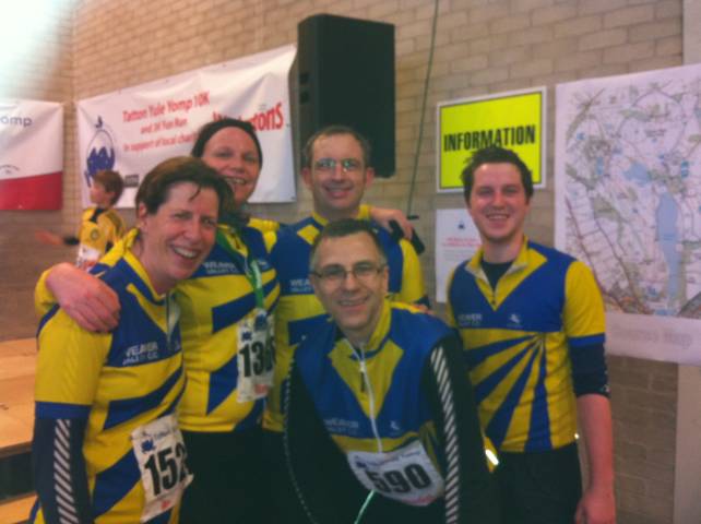 I think this must be a record – eight Weaver Valley cyclists (plus one son) representing WVCC in a 10k. In the picture are Julian and Elaine, Kev and me and our elder son David – unfortunately we couldn’t find Nick and Ann, nor Jane and Rob when we took the photo.