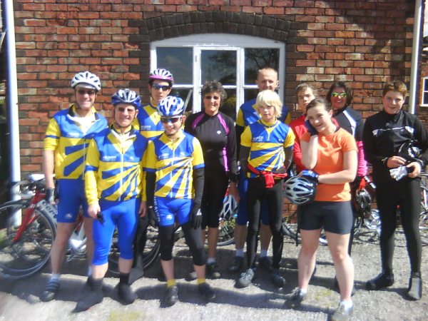 Three rides today – one longer one, one shorter one, and one for juniors and beginners – an excellent idea, and judging by the numbers at the British Royal Legion, one that is proving v. popular. Dave Fearon led this ride, Alan took the shorter ride to Nantwich Marina and Kev and I joined the longer ride to Prees, led by Chris Latter. We were joined by a small but well marked group including Martin, Lou, John C and Max and enjoyed a brisk ride out via Peckforton and Gallantry Bank – beautiful (but chilly) spring sunshine showing Cheshire off at its best. All v. uneventful until a pile up when Chris punctured and Lou and Martin went into the back of him – which must have looked fairly apocalyptic to the passing car driver – but all was well and they were back up quickly. Soon after Kev and I turned back home as we had a rugby match to watch that afternoon.