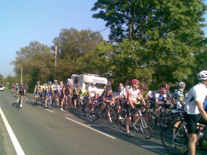 Here we all are, lined up before the race – nerves jangling, adrenalin pumping. A few WVCC riders in evidence – Kev, Nick B, Carol, John Keen, Julian, Andy Newby, Richard Munro, Mark Thompson and me – with Alan and Tim marshalling this week. A good race was had by all. Our race (Carol, Mark and I ride with the over 55s) was fast. A group of four rode off the front (with Mark hanging on to their coat tails) and the bunch spent 6 laps trying to catch them, and despite the fact that we had some well organised “through and offing” going on, we failed – which shows how well the leaders rode. I managed to contribute to the work in the first four laps and then hid at the back, and both Carol and I finished safely in the bunch, with an average of 23.7mph on my computer – it was a much more consistent effort this week because of the teamwork, we didn’t have the normal stop/start stuff going on. I’m not sure what happened in the other races – Kev and Nick got into a break of 8 riders, two went off the front and Nick pipped Kev to the post for third in their age group. Julian, John K and Richard reported a fast ride, with a nasty crash in the early laps.