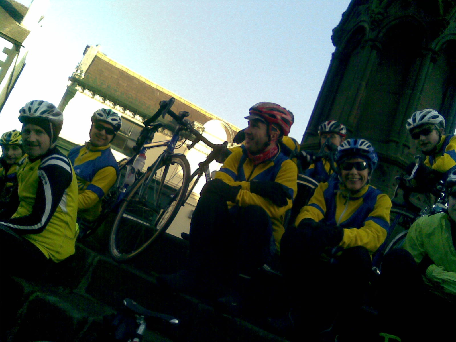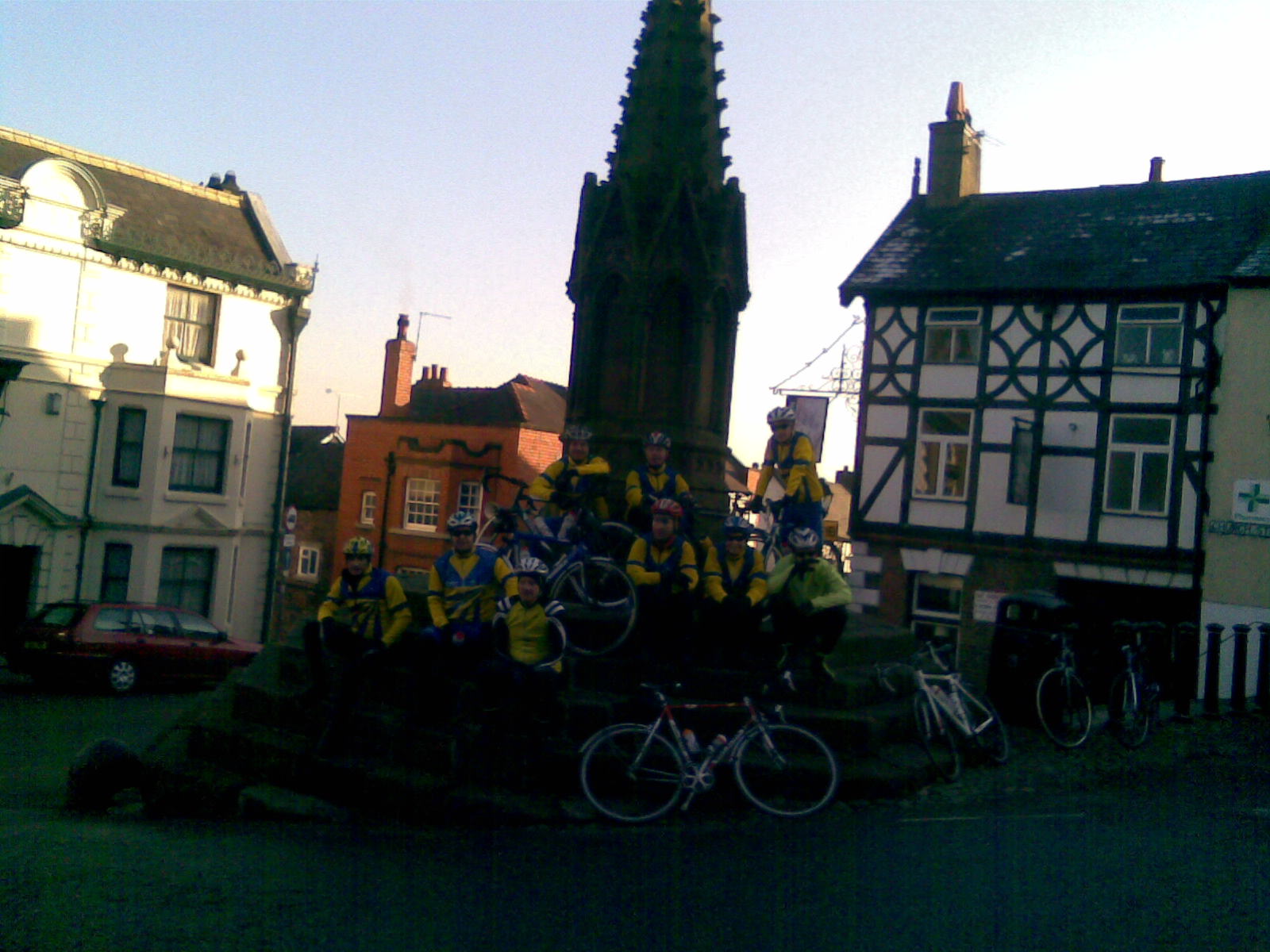 Sorry about the dark photos – young Titch is studying photography at Mid Cheshire so clearly we need to get him to take them in future! The reason the top one is so bad is because the sun was so bright and was directly behind us – so it doesn’t give any idea as to just what a beautiful sunny day it was. We had a great ride today. Graham led us to Prees via Nantwich and Whitchurch, then back on a great route which took us via Malpas (where the photos were taken), the Peckforton Hills and then (to avoid the closed bridge at the Shady Oak) via Bunbury. It was icy on some patches but we took the descents carefully and there were no mishaps. We had a companiable group out today and our front riders set a sensible pace so we kept together most of the time. Our group included youngsters James (who did a big share of riding on the front for us) Titch (who is doing really well) and me (!), and then for the”grown ups” we had Graham, Jules, John Conboy, Alan K, Howie, Ady and Carol (thanks for goading me on up the hills Carol!) Paul joined us on the way out but dropped out with knee problems – Paul, we hope you’re OK…I had 69 miles on the clock at the end of the day, and felt that I’d worked hard.